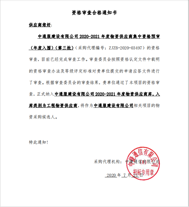 中通服建設(shè)有限公司2020-2021年度物資供應(yīng)商集中資格預(yù)審(年度入圍)(第三批)