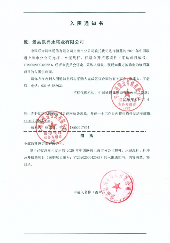 我公司于2020年6月3日 聯(lián)通入圍 ( 2019年河北聯(lián)通增高架、抱桿、鋼桿補(bǔ)充招募公告)