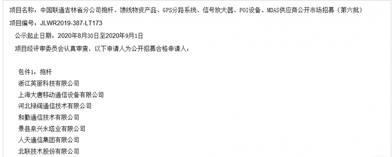 我公司于2020年6月3日 聯(lián)通入圍 ( 2019年河北聯(lián)通增高架、抱桿、鋼桿補(bǔ)充招募公告)